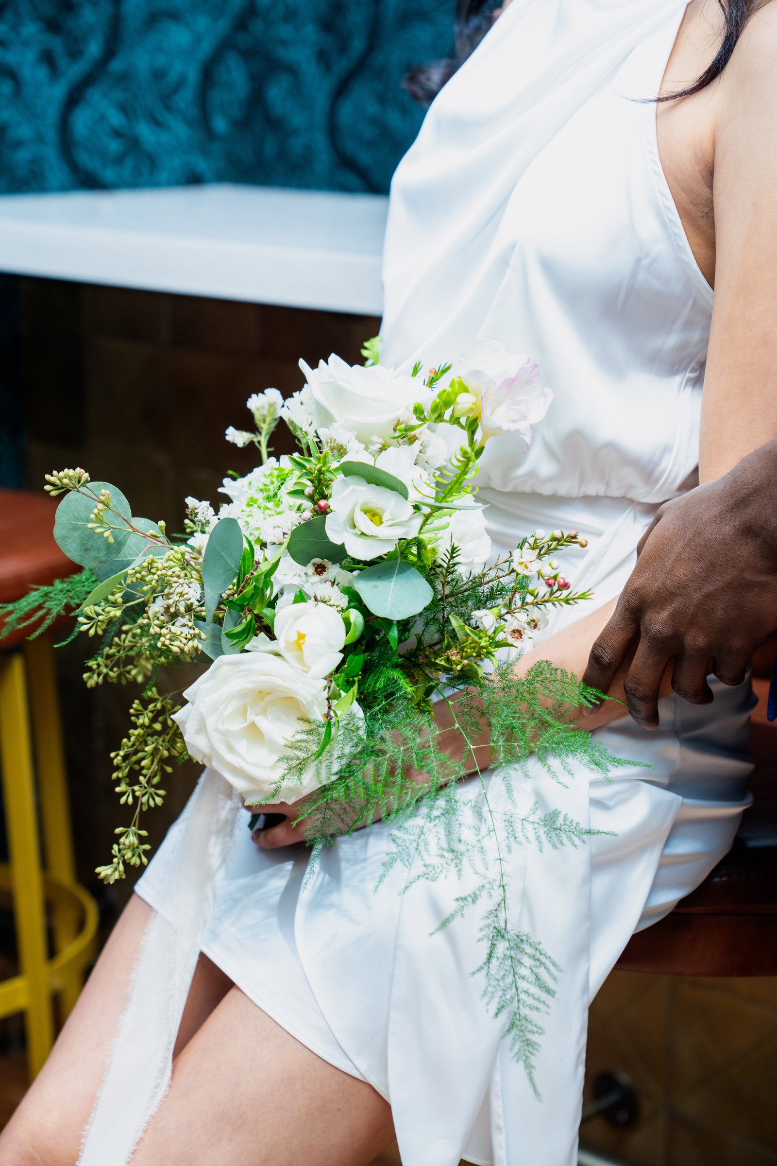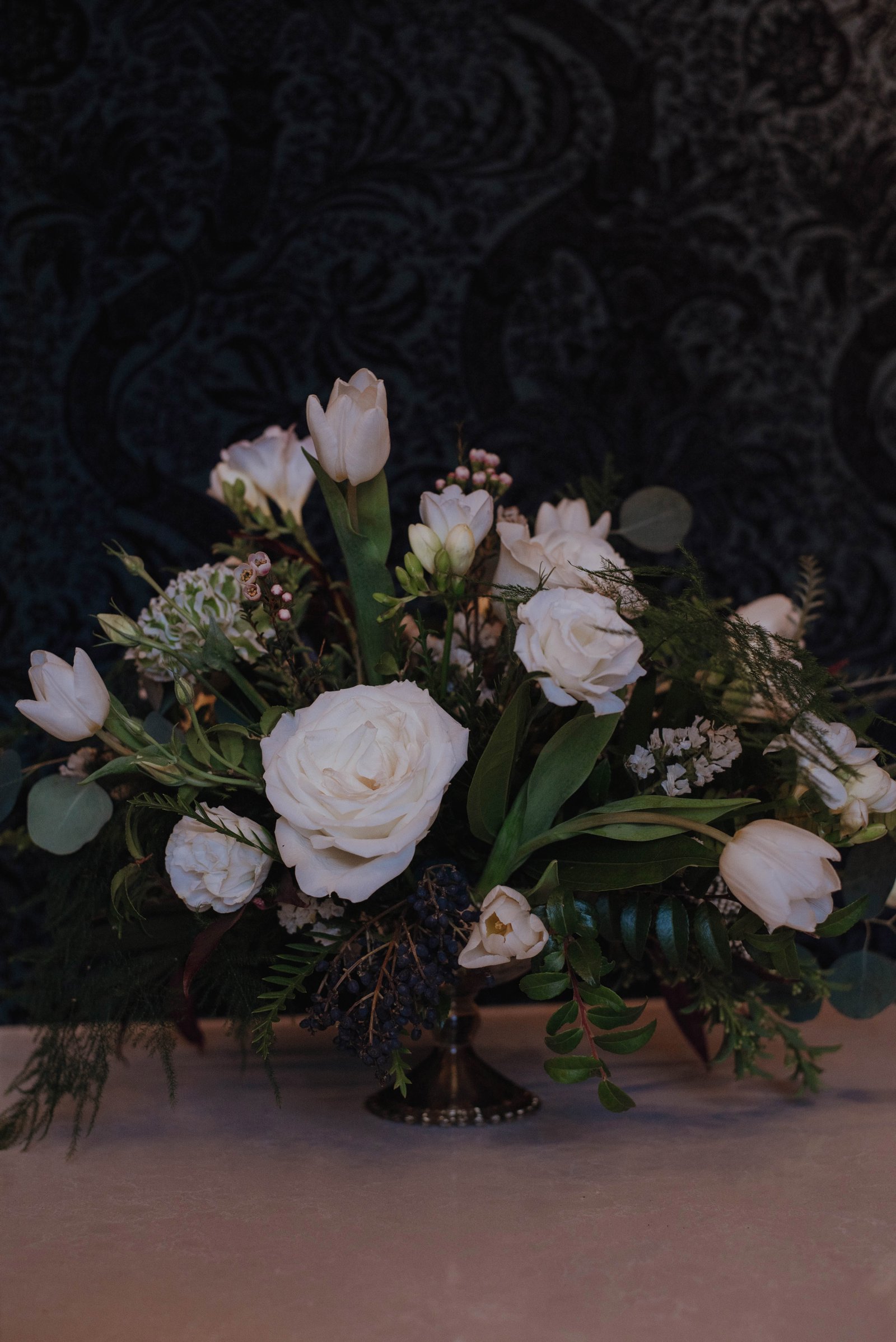 The florals were designed to complement the rich textures and bold colors of the traditional attire, creating a seamless flow between modern style and timeless cultural elements. Lush arrangements of white roses, tulips, and delicate greenery softened the boldness of gold accents and vibrant fabrics, bringing a sense of serenity and grace to the overall design.